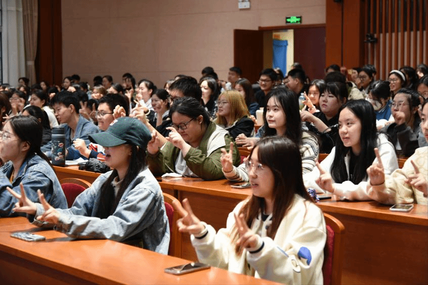 讲座伊始,李老师与同学们一起做“手指操”来缓解大家的压力,瞬间点燃会场内气氛,激发了同学们的热情与兴趣。