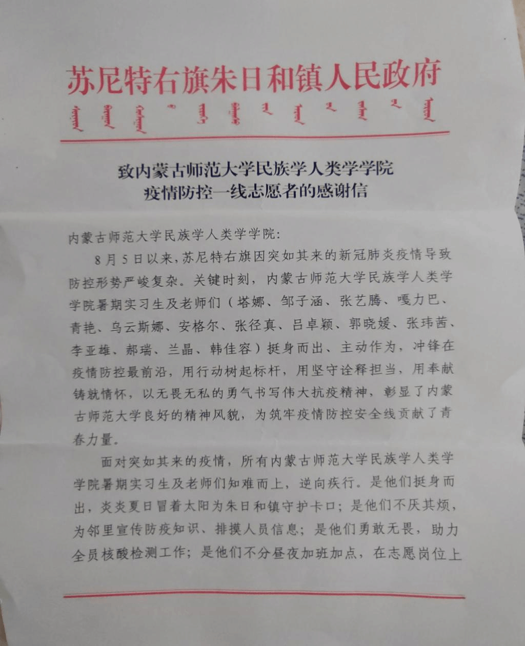 近日,苏尼特右旗朱日和镇人民政府向公司发来感谢信,对BG大游集团官方网站田野调查师生在新冠肺炎疫情防控中的突出贡献表示感谢,赞扬公司师生在疫情防控中表现出的挺身而出、主动作为、无私无畏、勇于担当的精神风貌。