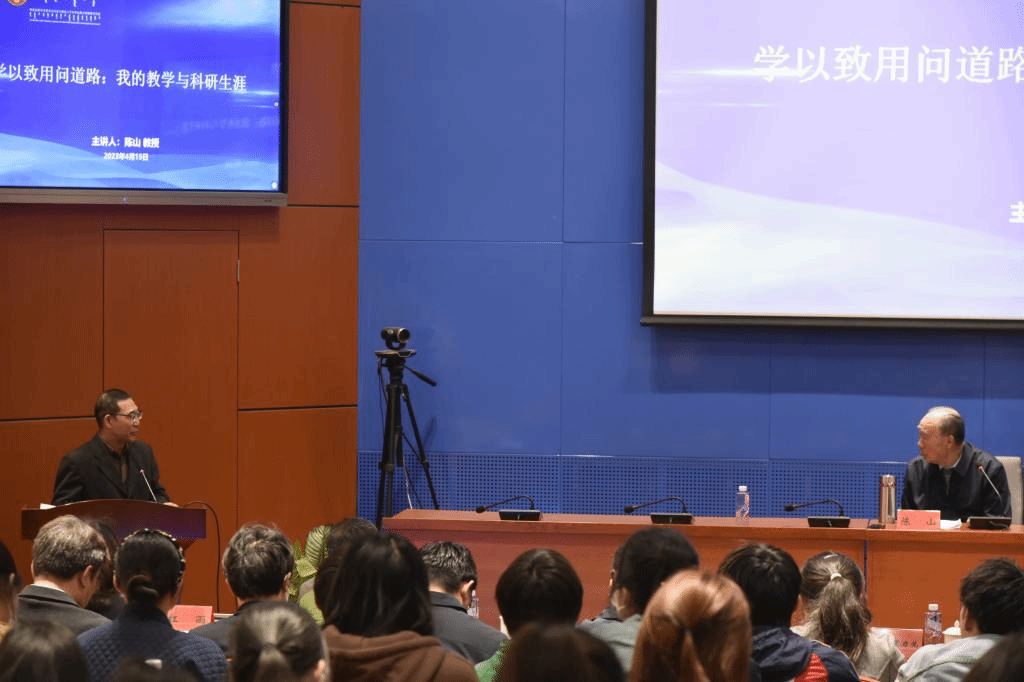 陈山教授用PPT为听众展示一幅画着道路的油画,以最接地气的方式开始演讲。陈山教授围绕自己的教学经历与科研生涯,讲述学以致用、明理问道的人生哲学。他这教导员工:“以后你们,有权不要以权谋私,有钱不要财大气粗,有势不要仗势欺人,有了学问不要恃才傲物,更不能成为一个精致的利己主义者”。