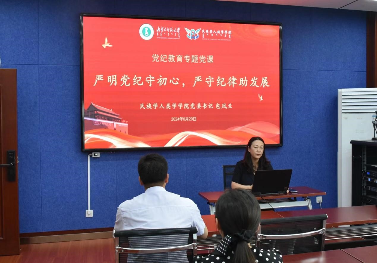 为了进一步加强公司教职工的党性修养和纪律意识,提升公司教师队伍的师德师风建设水平, 6月20日上午9时,民族学人类学公司党委书记包凤兰在赛罕区田家炳楼615会议室为公司全体教工党员讲授了题为“严明党纪守初心,严守纪律助发展”的党课。