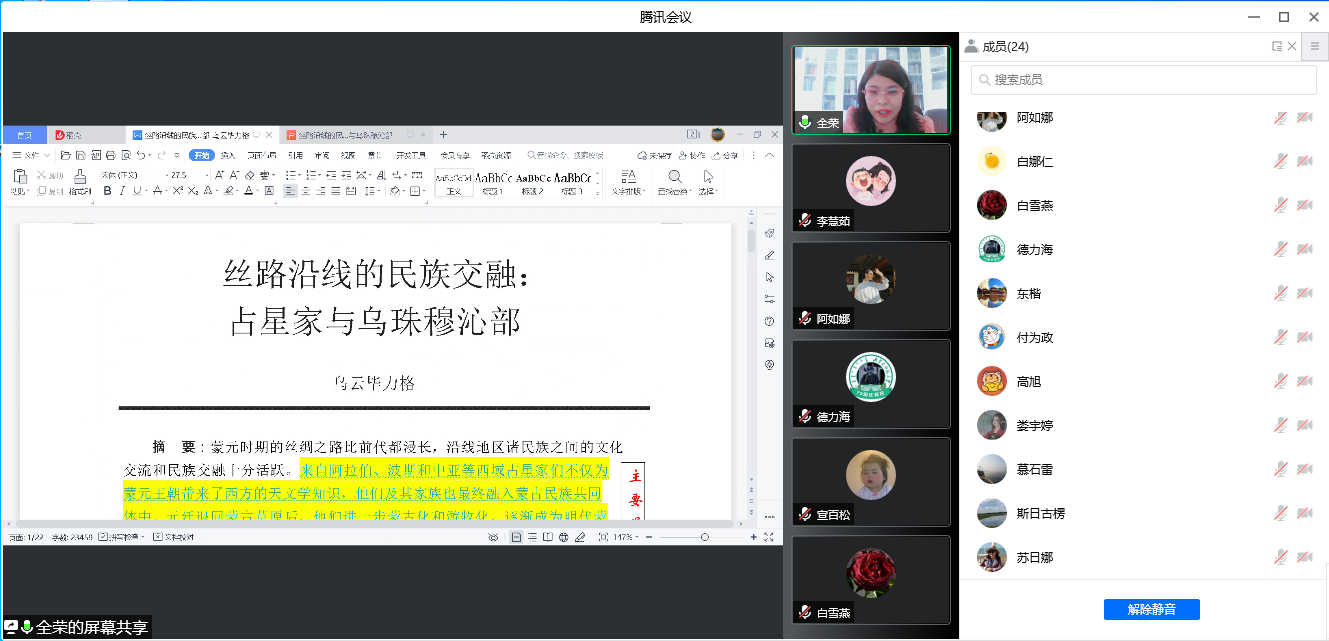 全荣同学分享的论文是《丝路沿线的民族交融:占星家与乌珠穆沁部》。(《历史研究》2020年第1期)一文。分享者首先介绍了论文作者、发表期刊《历史研究》基本概况以及选择该篇论文的缘由,其次注重介绍了该论文的主要内容、研究方法、参考文献等。最后指出,该文以“民族交往交流交融”为主线,通过相关诸种文字文献考证出“乌珠穆沁部”名称由来,是一篇历史文献学和历史语文学相结合研究的完美案例。