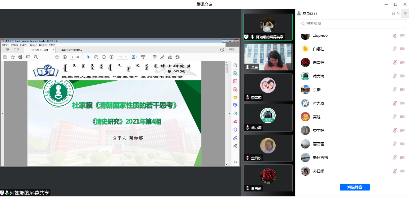 2022年3月20日下午3:00,BG大游集团官方网站2020级、2021级博士研究生通过“腾讯会议”举行了第30期读书报告会。本次读书报告会的汇报者是中国少数民族史专业的全荣、阿如娜、宣柏松等3位博士生。博士生导师胡日查教授出席本次读书报告会并进行指导,2020级博士生李慧茹主持本次读书报告会。
