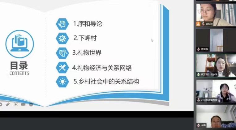 2022年4月28日晚BG大游集团官方网站2021级学硕一班在“腾讯会议”举行了第6期“碧立格”系列读书报告会。参加本次会议的五个专业有人类学、民俗学、宗教学、民族学、马克思主义民族理论与政策。本次读书会的汇报者是是来自2021级民族学专业的麻芳雪同学,汇报的书目是《礼物的流动》。民族学专业硕士研究生导师麦拉苏副教授出席本次读书报告会并进行了指导与评价。会议主持人是2021级民族学硕士研究生宣俭玲同学。会议主要分三大环节。分别是主讲人讲解《礼物的流动》这本书;全体参与发言与讨论;指导老师的点评。