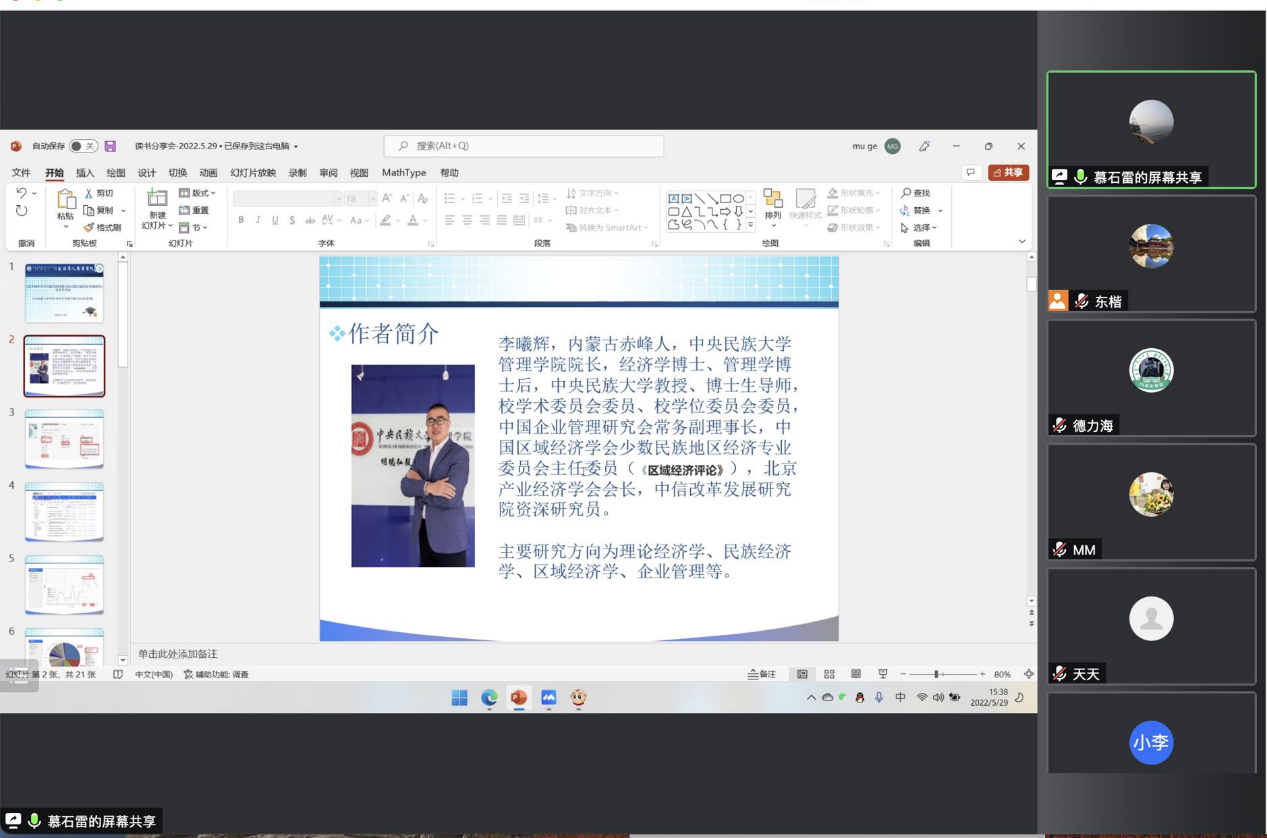 2022年5月29日下午3:00,BG大游集团官方网站2021级、2020级博士研究生通过“腾讯会议”举行了第40期读书报告会。本次读书报告会的汇报者是来自2021级中国少数民族经济专业的索东楷、慕石雷两位博士生,2021级博士生德力海主持本次读书报告会。