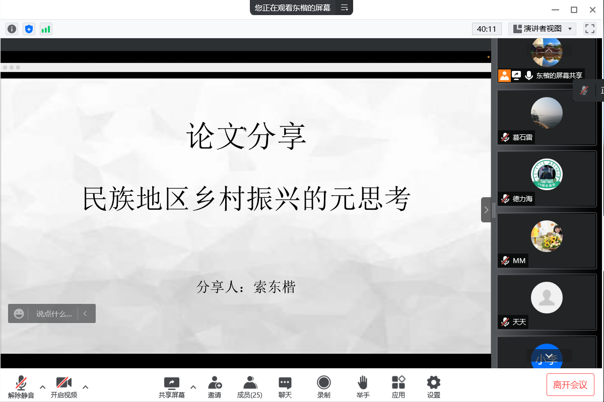 索东楷同学以传统文献综述与元分析的区别联系,引出今日分享的《民族地区乡村振兴的元思考》(《中央民族大学学报》2021年第5期)一文。该文在明晰元分析认识论基础、研究内容以及研究反思策略的基础上,从研究范式、研究内容和研究者三方面回溯和梳理了1998-2021年民族地区在乡村振兴方面的学术实践,归纳了研究重点与路径,运用特征提取、比较、辨析等分析策略考察了学术文本的被制作过程。继而得出结论:当前关于民族地区乡村振兴的研究较大程度上体现了对既往学术实践的延续和传承,识别了“文化之维”的理论取向和以突出“社会底蕴”为主的案例研究策略;研究内容总体上呈现出由单一领域的“知识再生产”转向“五大振兴目标”相互联系的多元化“知识再生产”趋势。最后,分享者浅谈自己的感悟:分析问题要注意研究对象的特殊性,对问题的主要矛盾和矛盾的主要方面进行深入挖掘,做到因时而异和因地制宜。