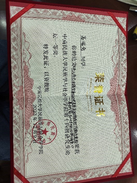民族学专场结合不同的视角对铸牢中华民族共同体意识下的历史、文化与行动的多元面向进行探讨,公司2023级民族学硕士研究生高瑞奇同学以《济人利己:村落农事活动中“差序”互惠格局的式微与重构——基于内蒙古N村的田野调查》为题做汇报,并荣获第十四届研究生论坛民族学专场一等奖。