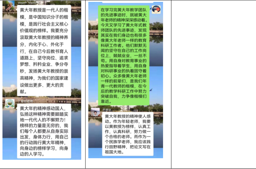 学习后,党员同志们感受颇多,在学习群中自由发表了自身的学习心得和感悟。多数教师党员认为模范就在身边,不用好高骛远,只要脚踏实地,兢兢业业,便是对黄大年老师及众多模范教育工作者精神的最大领悟。还有教师党员认为成果不是说出来的,而是一丝不苟的干出来的,多做实事才是硬道理。新入职的年轻党员教师同志们更是备受先进事迹的鼓舞,立志在岗位上,认真教学、认真科研,努力做一名合格的教师和一名合格的党员,把教学科研做在祖国的大地上。